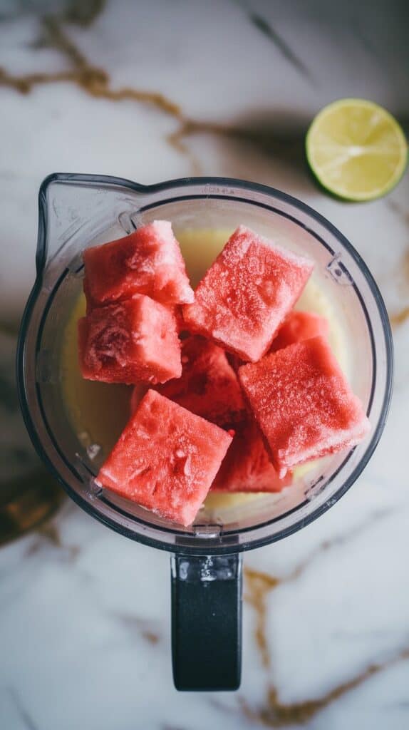 Step 1: Add 3 cups frozen watermelon cubes to blender