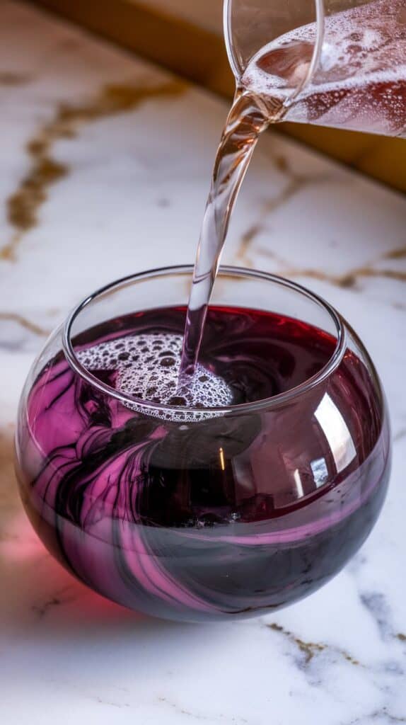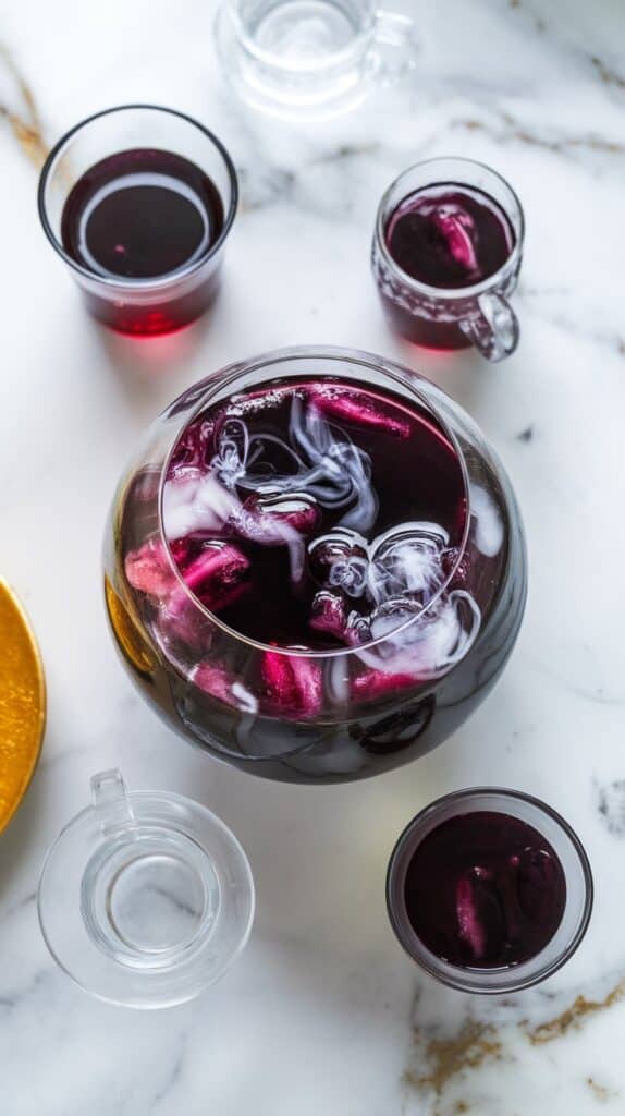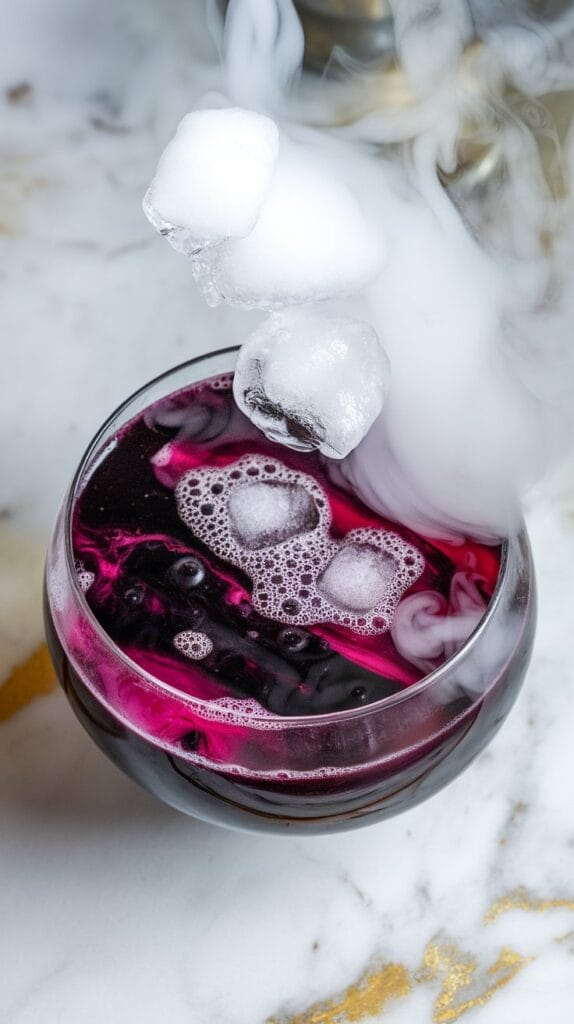 This drink is pure Halloween magic. It’s dark, fruity, fizzy—and it smokes with a little dry ice.