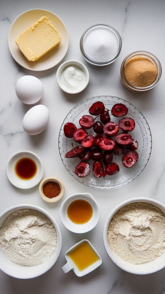 This recipe came from a morning when I had friends coming over and a big bowl of cherries that needed using. I didn’t want a full pie or anything too fussy. This coffee cake ended up being exactly right — simple, satisfying, and full of flavor. Now it’s a go-to for weekend bakes.