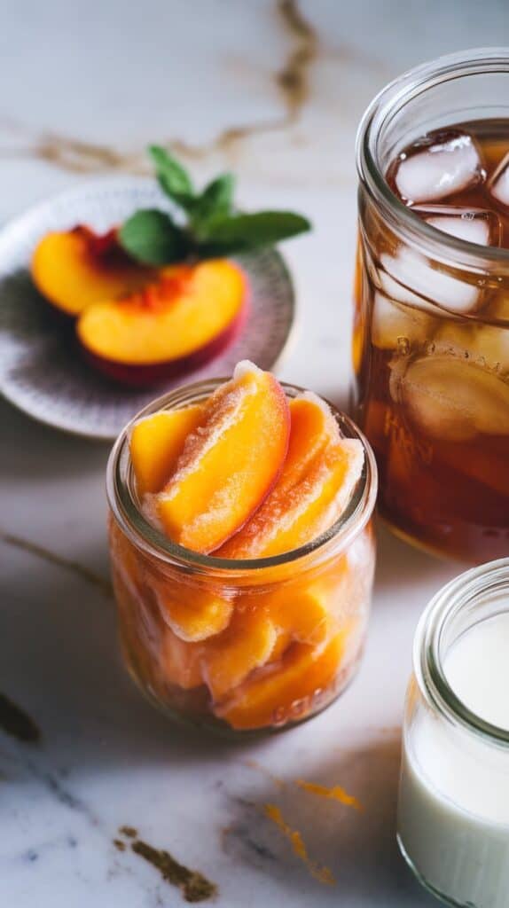Frozen peaches do double duty: they chill the slushie and bring that rich fruit flavor. The sugar in sweet tea helps keep the slushie texture smooth, while milk blends in for a creamy body that still lets the tea shine through. The cold temperature locks in all the best flavors.