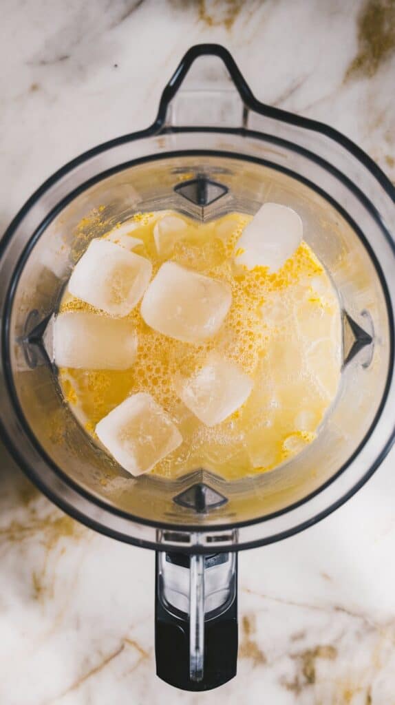 Add the lemon juice mixture and 3 cups ice cubes to your blender. Blend until thick and slushy.