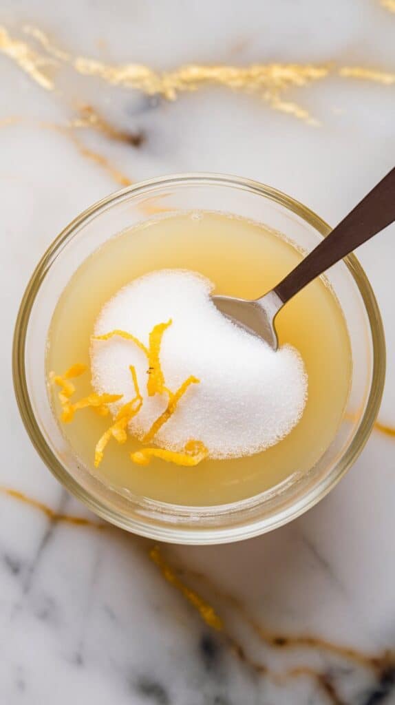 In a small bowl, stir together 1/2 cup lemon juice, 1/3 cup granulated sugar, and 1 tablespoon lemon zest until sugar is mostly dissolved.