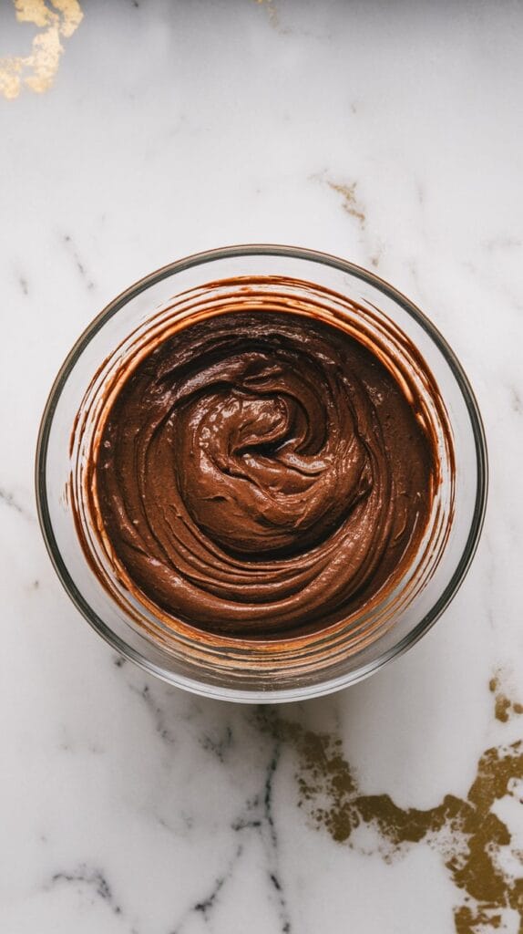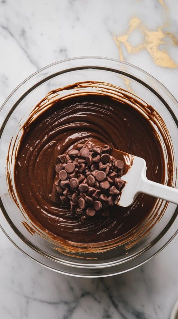 Pour batter into a parchment-lined 9×9 pan, sprinkle extra chocolate chips on top, and bake at 350°F (175°C) for 30 minutes, until set but fudgy.
