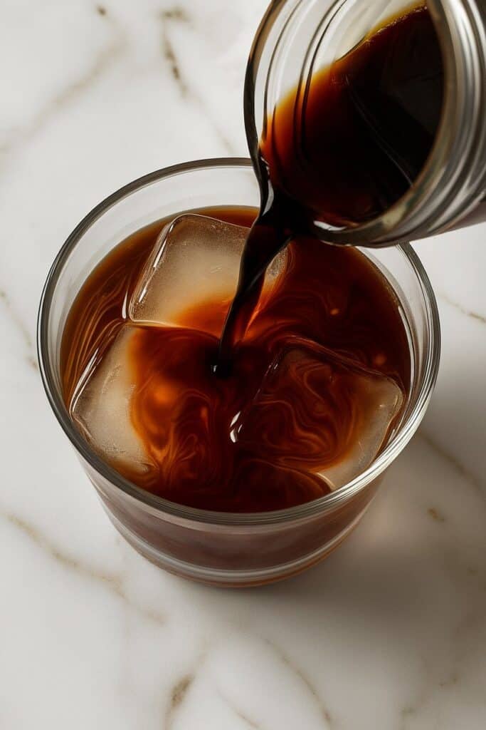 Next, pour 1 oz of coffee liqueur (like Kahlúa) into the glass.
