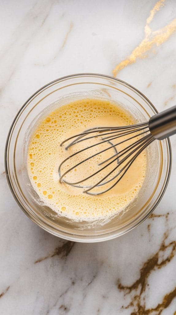 In a separate bowl, whisk together 1 cup milk, 1 large egg, 2 tablespoons melted butter, and 1 teaspoon vanilla extract until smooth and slightly frothy.