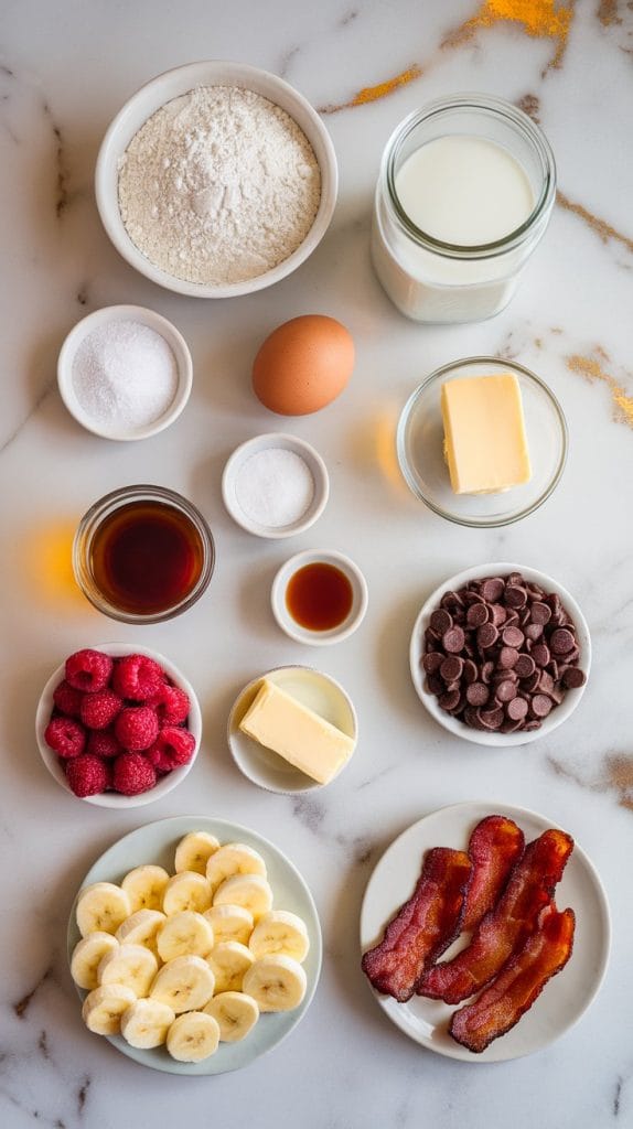 The baking powder helps the pancakes rise and get fluffy. The melted butter adds flavor and helps the edges brown nicely. The banana and raspberry toppings bring in natural sweetness and texture. The bacon gives a salty contrast that balances the sweet — perfect bite every time.