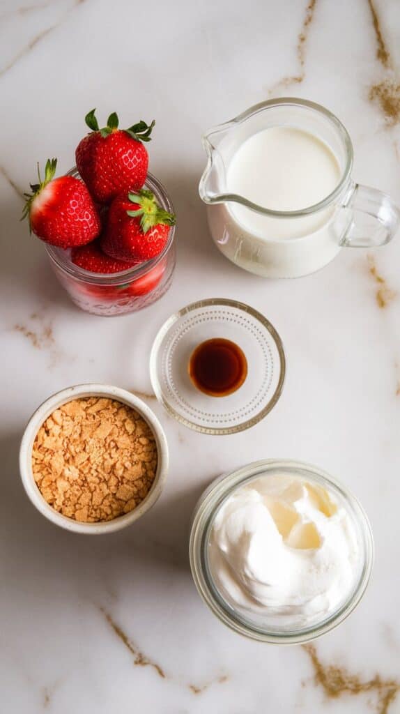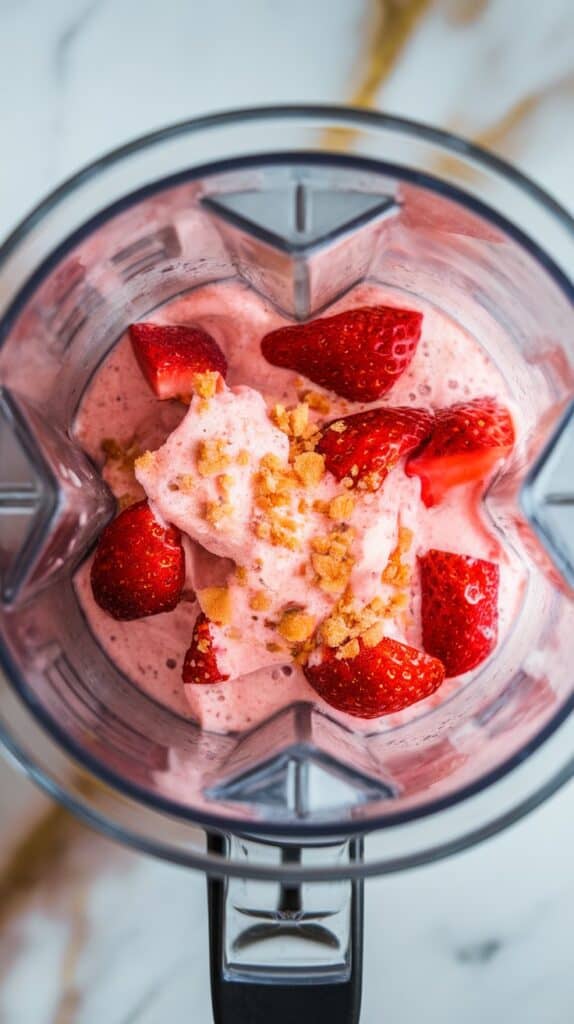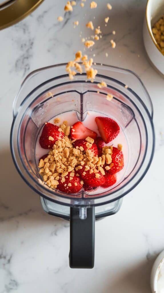 Frozen strawberries act like mini ice cubes, giving that frosty slushie texture without watering it down. Blending them with milk emulsifies the fat and liquid, making it creamy. The graham cracker crumbs add just enough starch and crunch to mimic shortcake without being soggy.