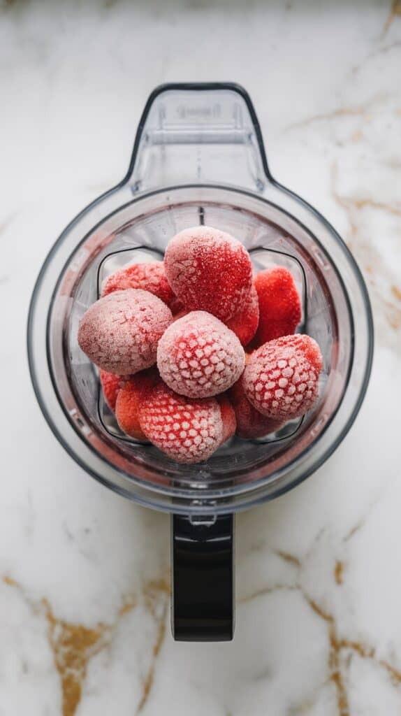 What to do: Add 2 cups of frozen strawberries into your blender. No need to thaw.