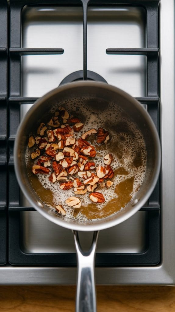 In a small saucepan over medium heat, combine 4 tbsp butter, ½ cup packed brown sugar, 2 tbsp heavy cream, and ¼ tsp salt. Stir until smooth and bubbling, about 3–4 minutes. Stir in ¾ cup chopped pecans and cook 1 more minute. Remove from heat.