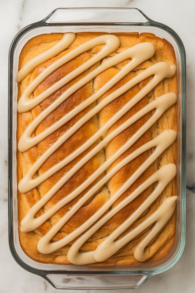 Once the cake is out of the oven and still warm, pour the glaze over the top and spread gently.