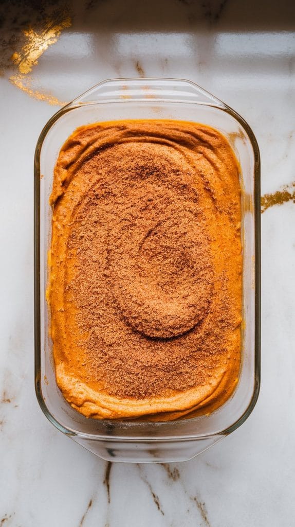 Spray a 9×13-inch baking dish with non-stick spray. Pour half of the batter into the dish. Sprinkle the cinnamon sugar mixture evenly over it. Add the rest of the batter on top and spread it smooth.