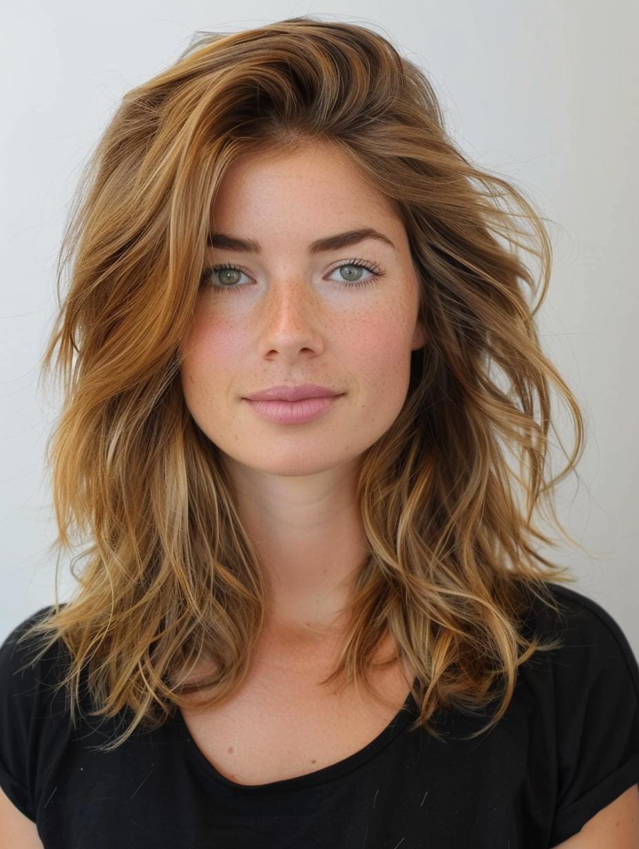 The tousled shoulder-length waves in this style are highlighted with a warm, golden blonde. This haircut offers a relaxed and effortless vibe, ideal for those looking for a casual and pretty look. It’s perfect for women with round or square face shapes, adding softness and femininity to the overall appearance.