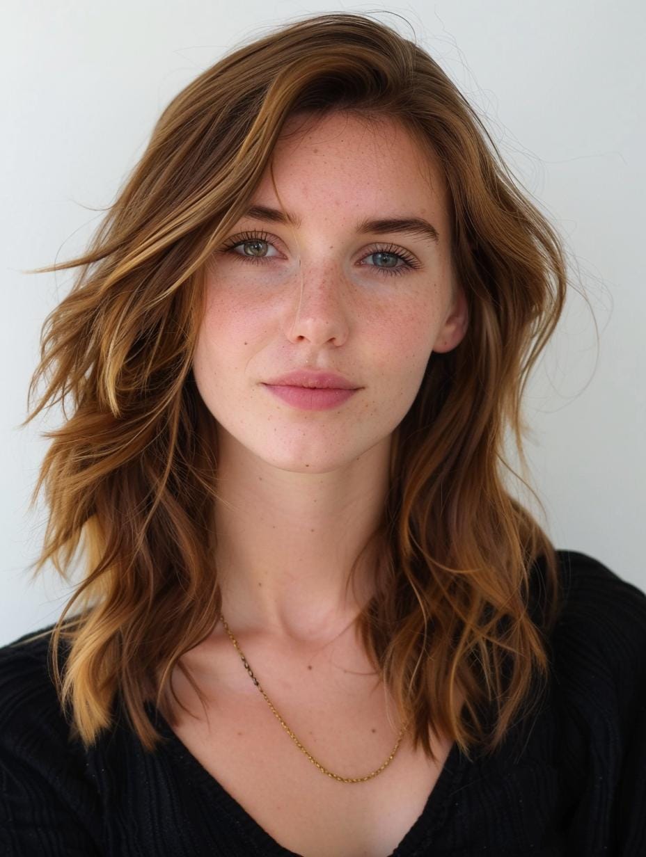 The shoulder-length layers with subtle highlights add dimension and movement to the hair. This medium length style is perfect for women with oval or heart-shaped faces, offering a versatile and pretty look. The soft brown color with lighter highlights complements a variety of skin tones, making it ideal for casual outfits.