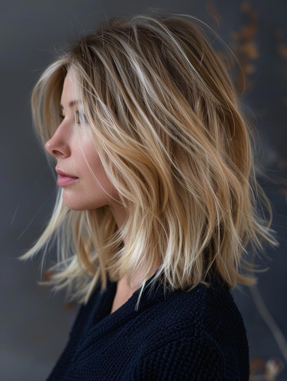 The voluminous layers with side swept bangs add texture and movement to this medium length haircut. The warm blonde color gives a sun-kissed appearance, ideal for women with oval or heart-shaped faces. This style is both pretty and casual, fitting well into various outfits and settings.