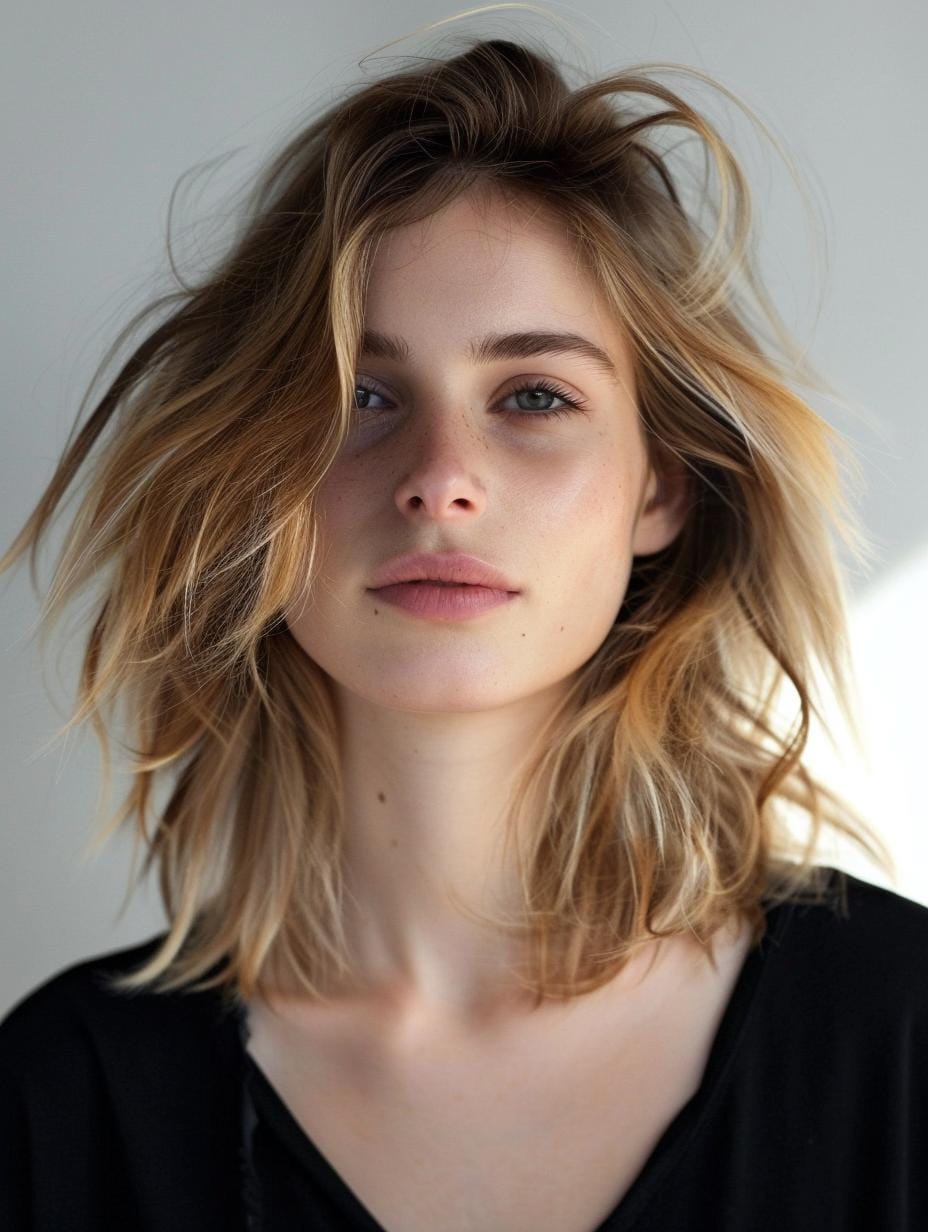 Shaggy layers with blonde highlights add texture and dimension to this medium length haircut. The warm blonde color enhances the layers, creating a trendy and aesthetic look. Suitable for oval and heart-shaped faces, this style fits well into casual outfits and everyday settings.
