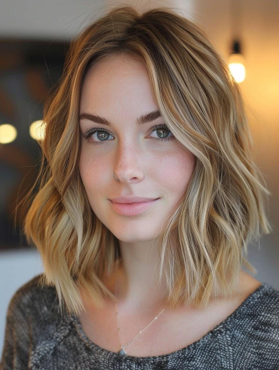 The wavy lob with light highlights adds a touch of brightness and dimension to this medium length haircut. The soft waves and light blonde highlights create a relaxed and aesthetic look, ideal for women with oval or heart-shaped faces. This style is both cute and casual, fitting well into different outfits.