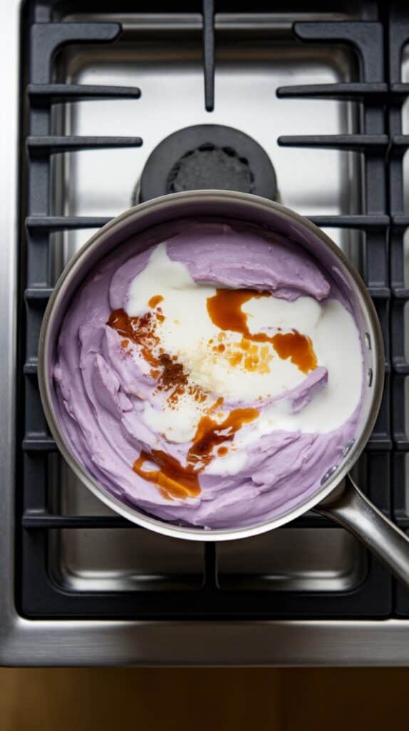 In a saucepan, combine the mashed ube, 1 cup coconut milk, ½ cup sweetened condensed milk, 2 tbsp maple syrup, 1 tsp vanilla, and a pinch of salt.